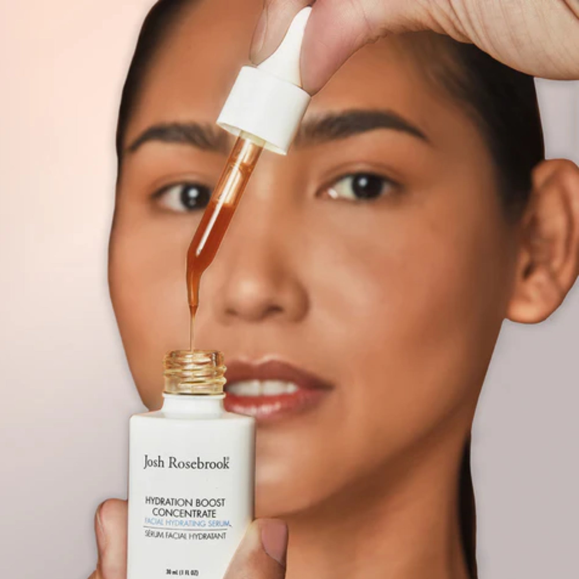 While the face is wet with the Hydrating Accelerator, apply 2 drops of the Josh Rosebrook Hydration Boost Concentrate over face and neck using circular pressing motions.