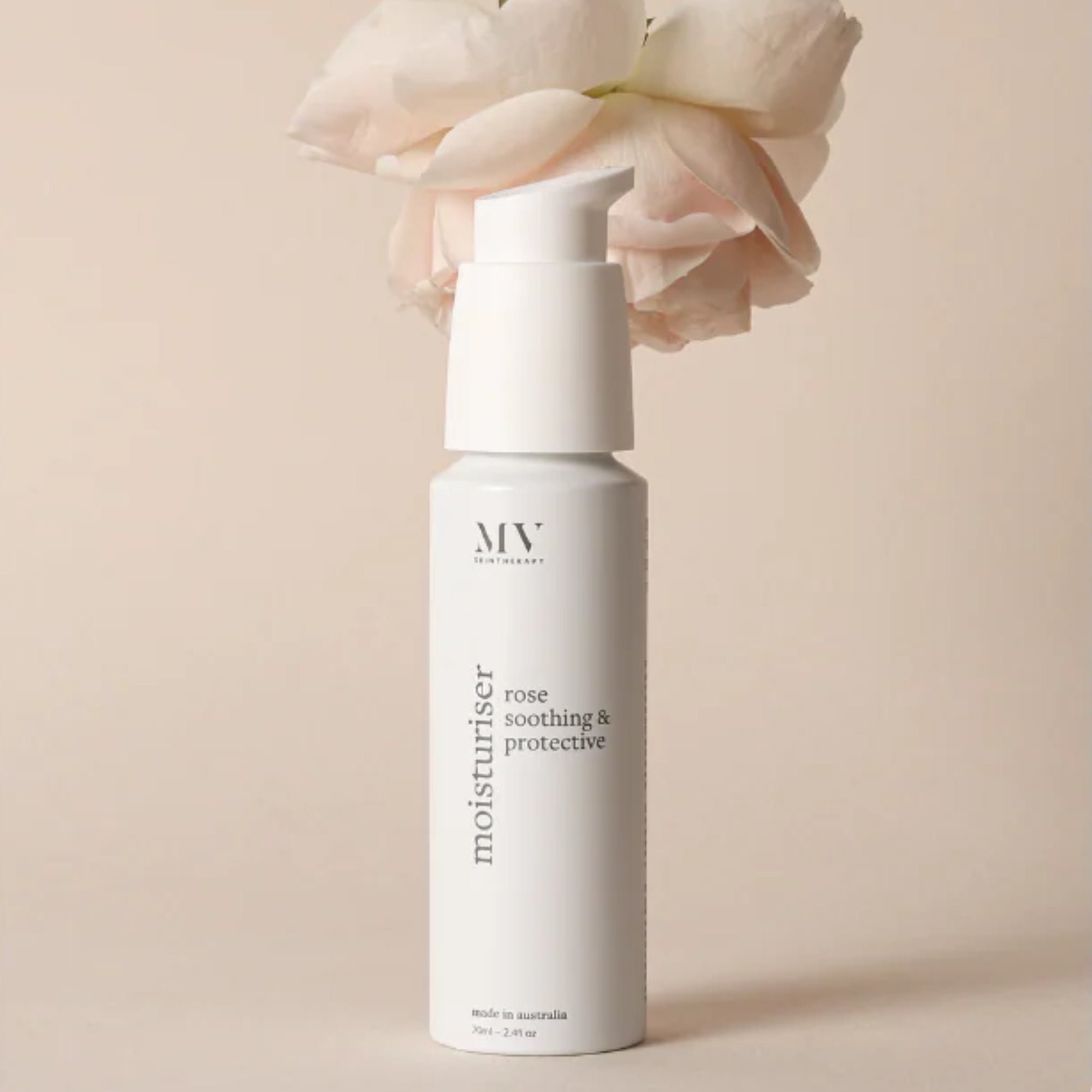 Spritz with MV Skintherapy Rose Hydrating Mist then smooth one pump over face & neck with relaxed palms.